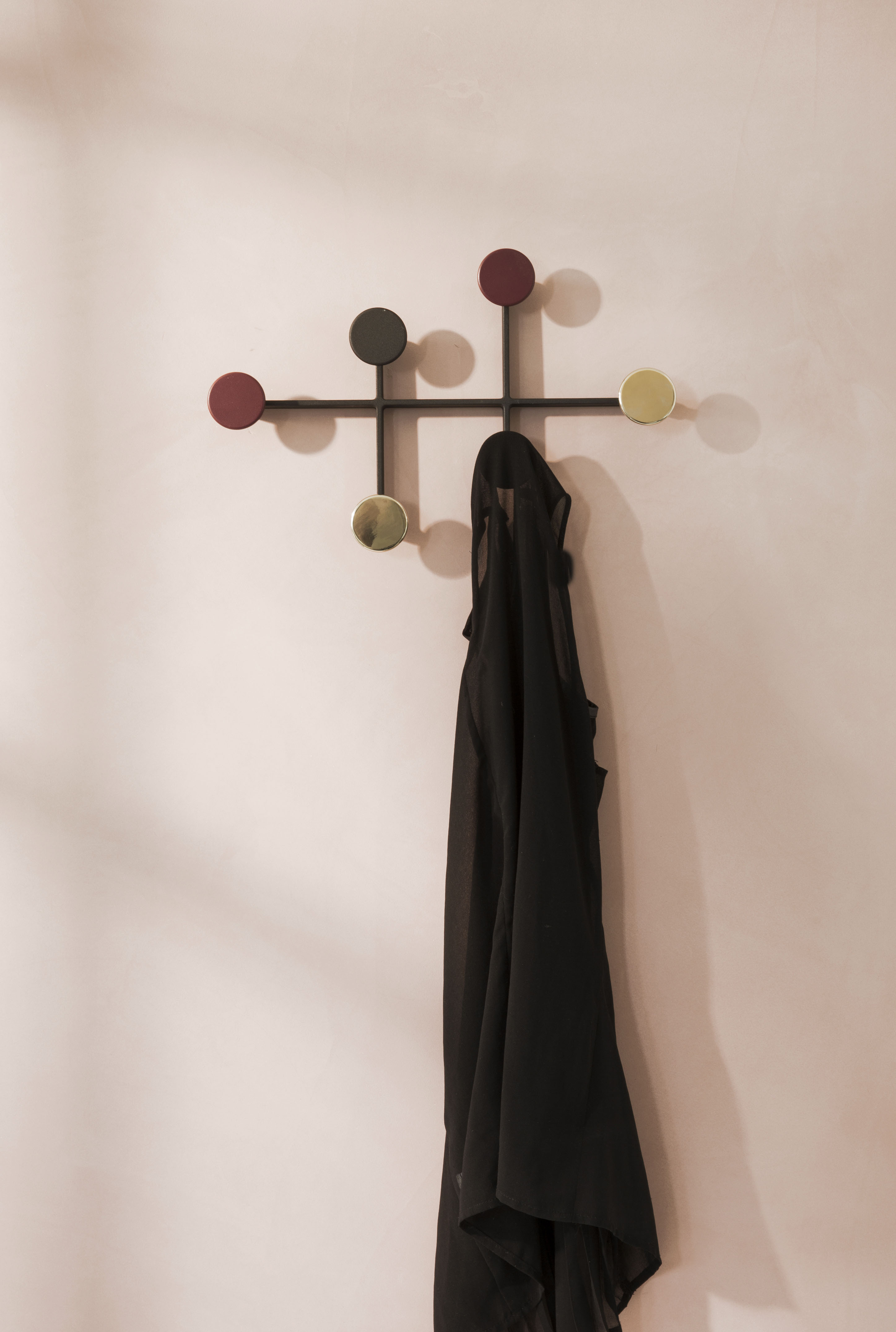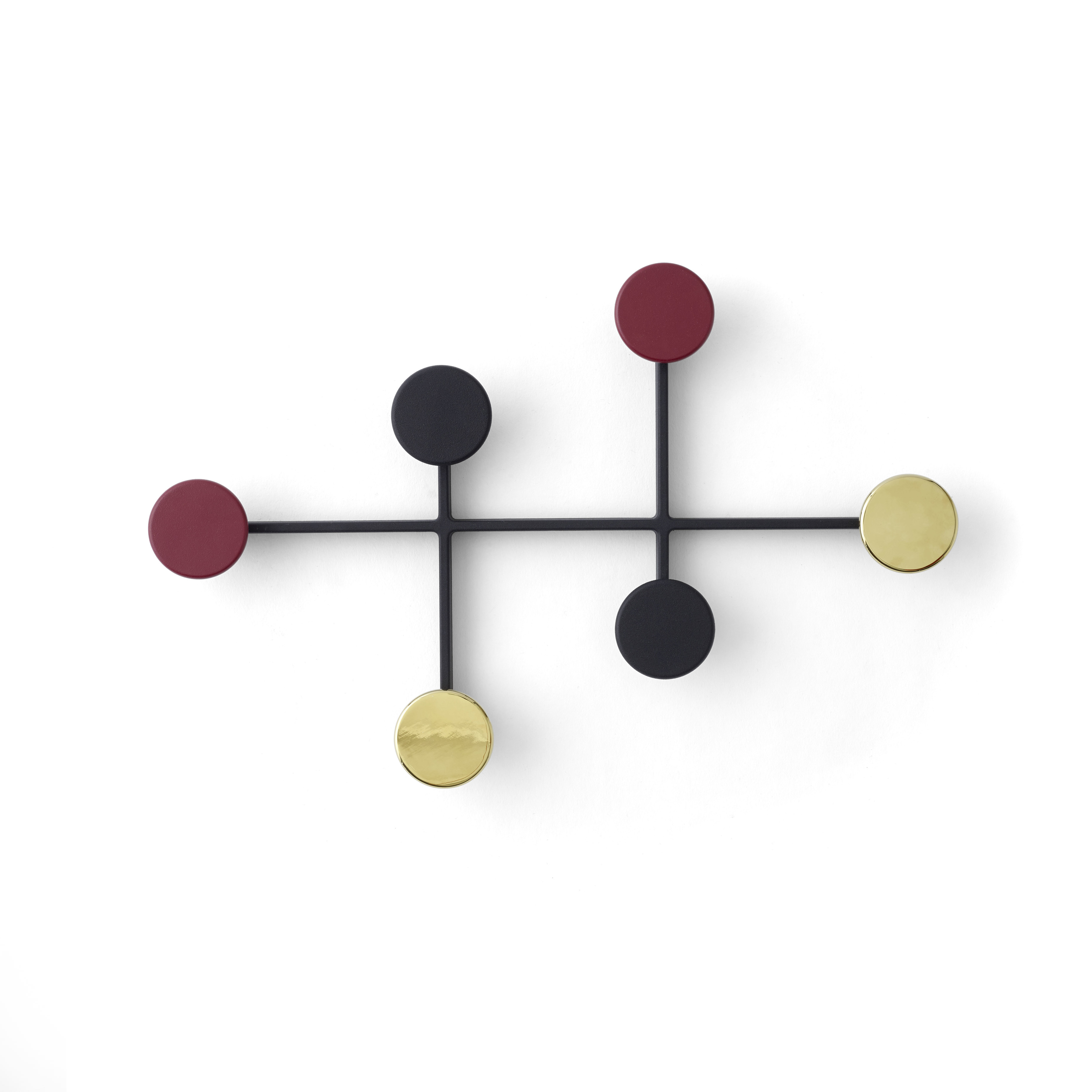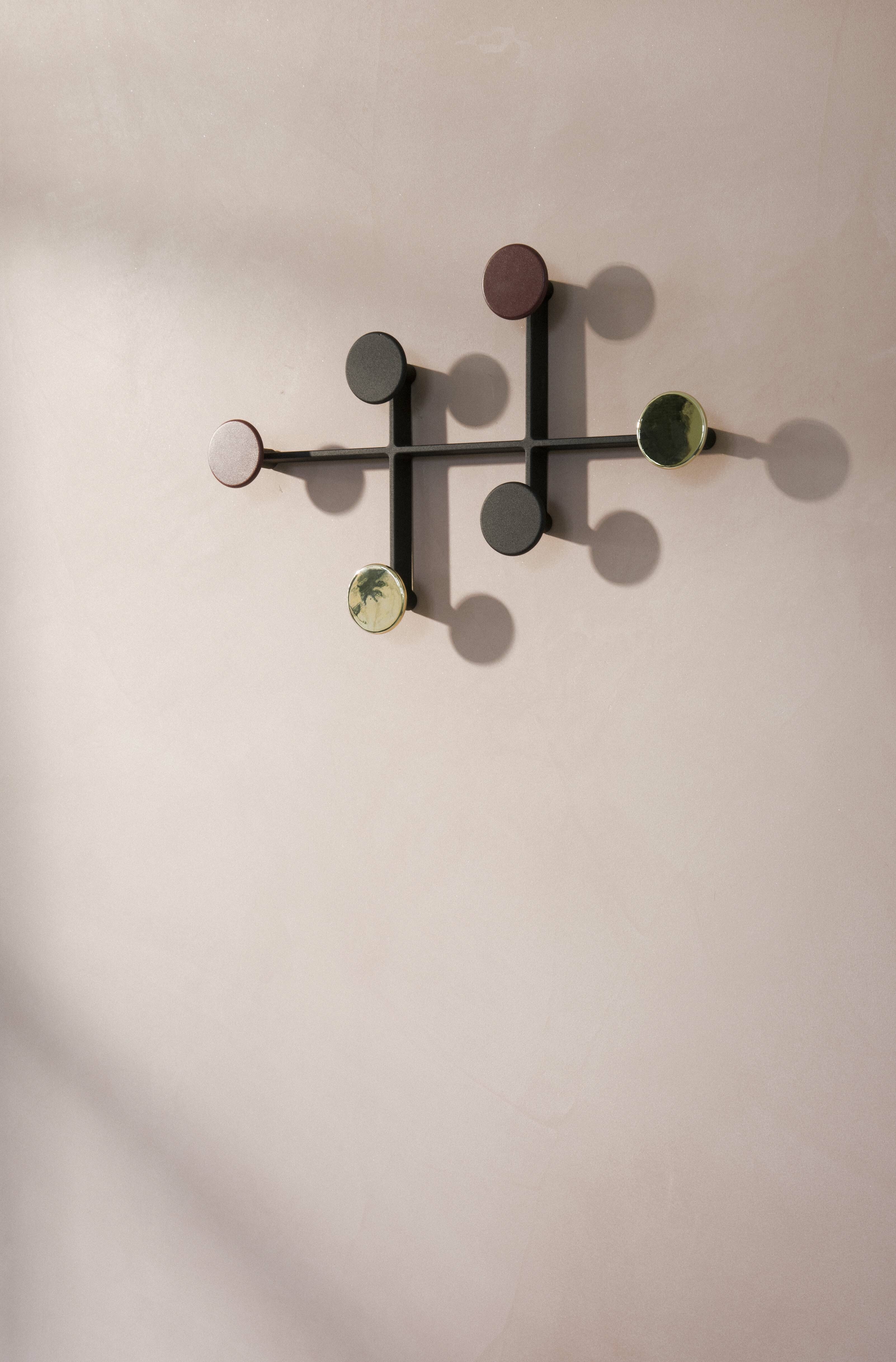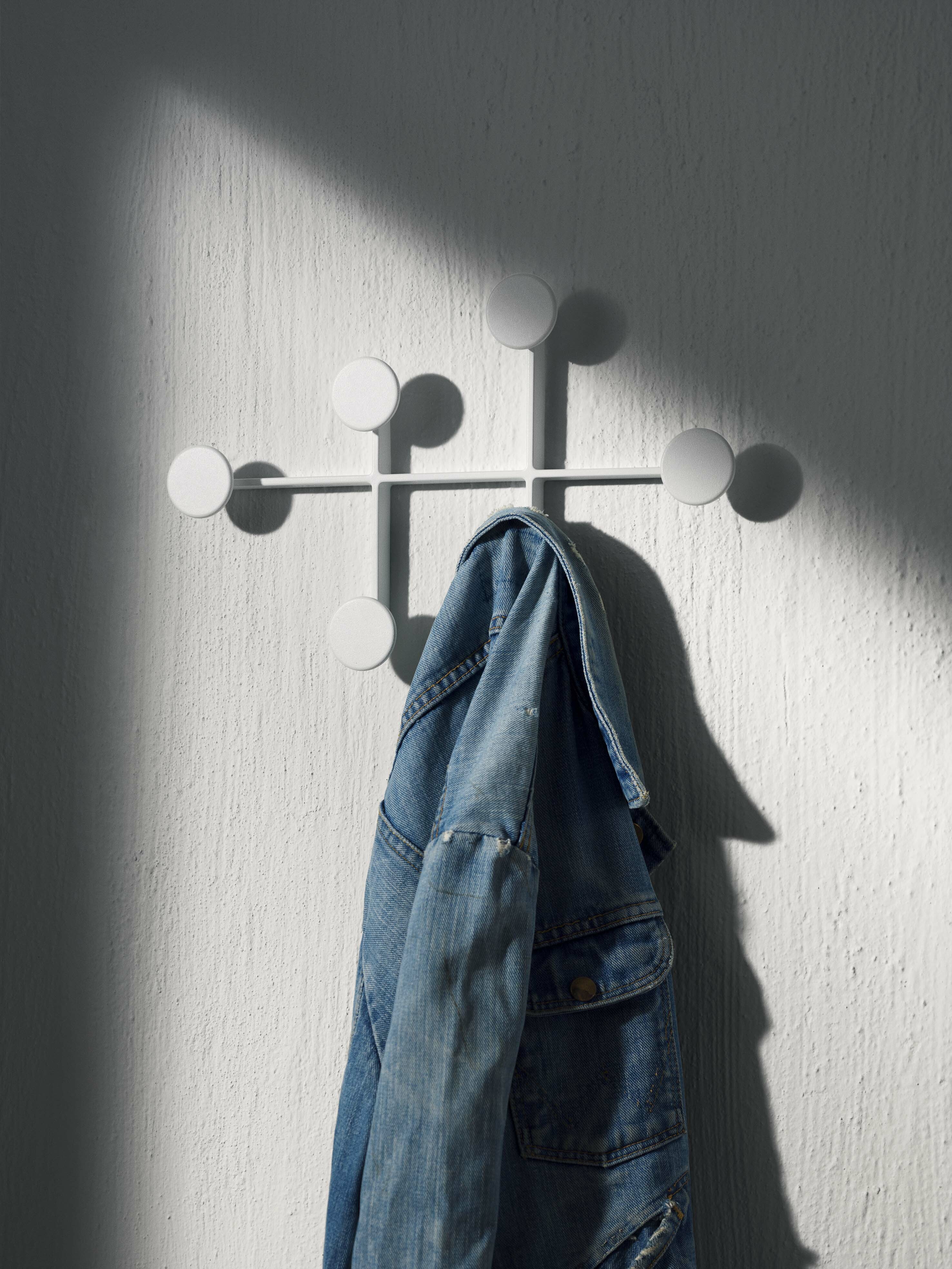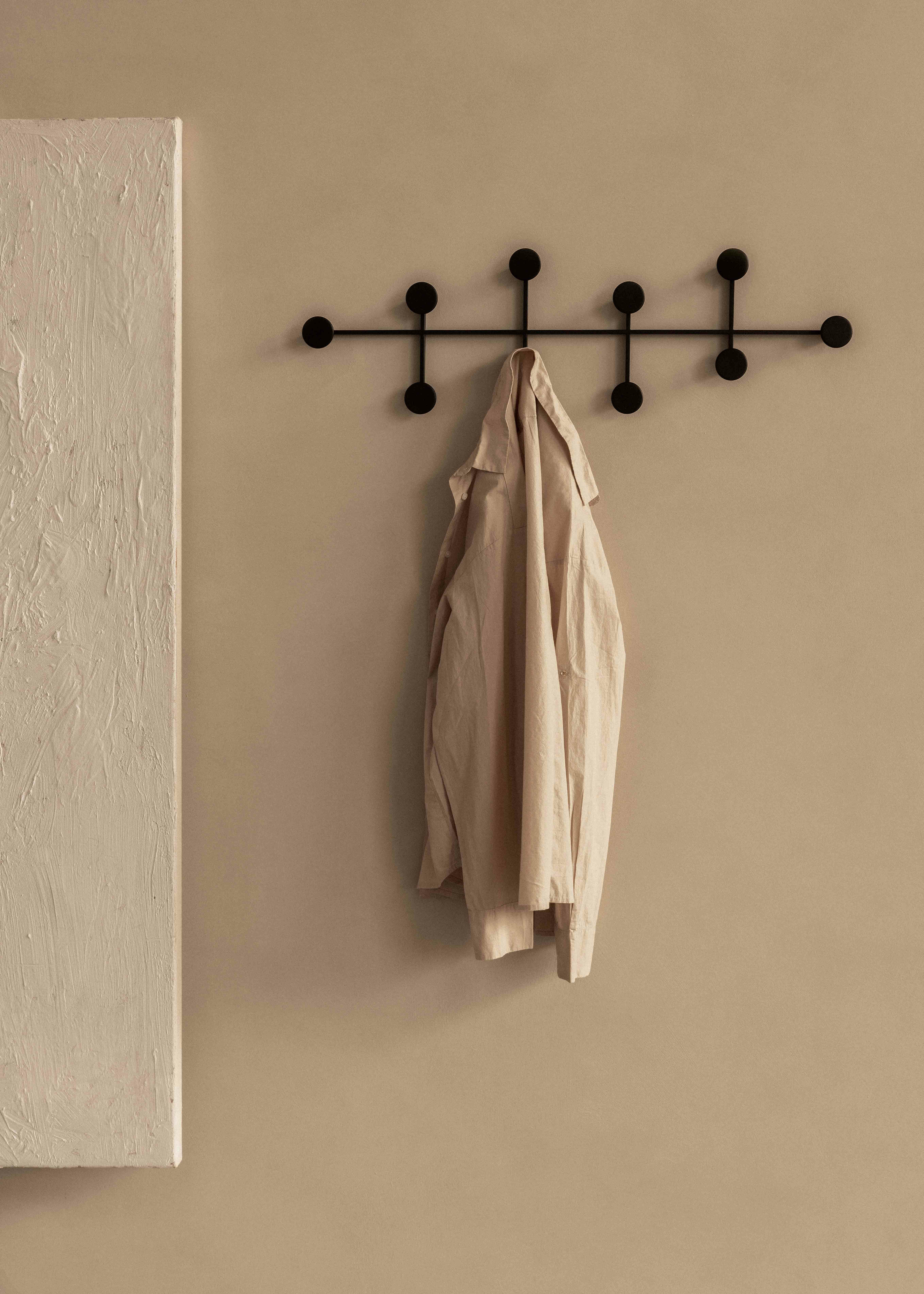 Afteroom 衣架從包浩斯風格中汲取靈感,以幾何形狀注入一股清晰感。金屬製成的圓點可輕鬆固定在牆上,隱藏式螺絲鞏固了其簡潔的美感,實用且簡約的造型設計,可讓您在走廊或臥室懸掛衣服、包包等物品。Afteroom 衣架可以水平或垂直懸掛,也可作為擺設或藝術品。