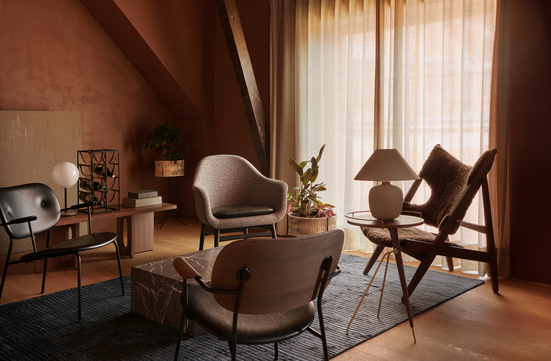 由Arthur Umanoff所設計的中世紀現代酒架,鐵件加上皮革掛繩設計,簡潔俐落的線條構造、優雅的幾何弧線與巧妙的異材質結合,讓工業風的金屬收納架,添了幾分柔和感,展現實用迷人、時髦又帶點復古的現代風格。