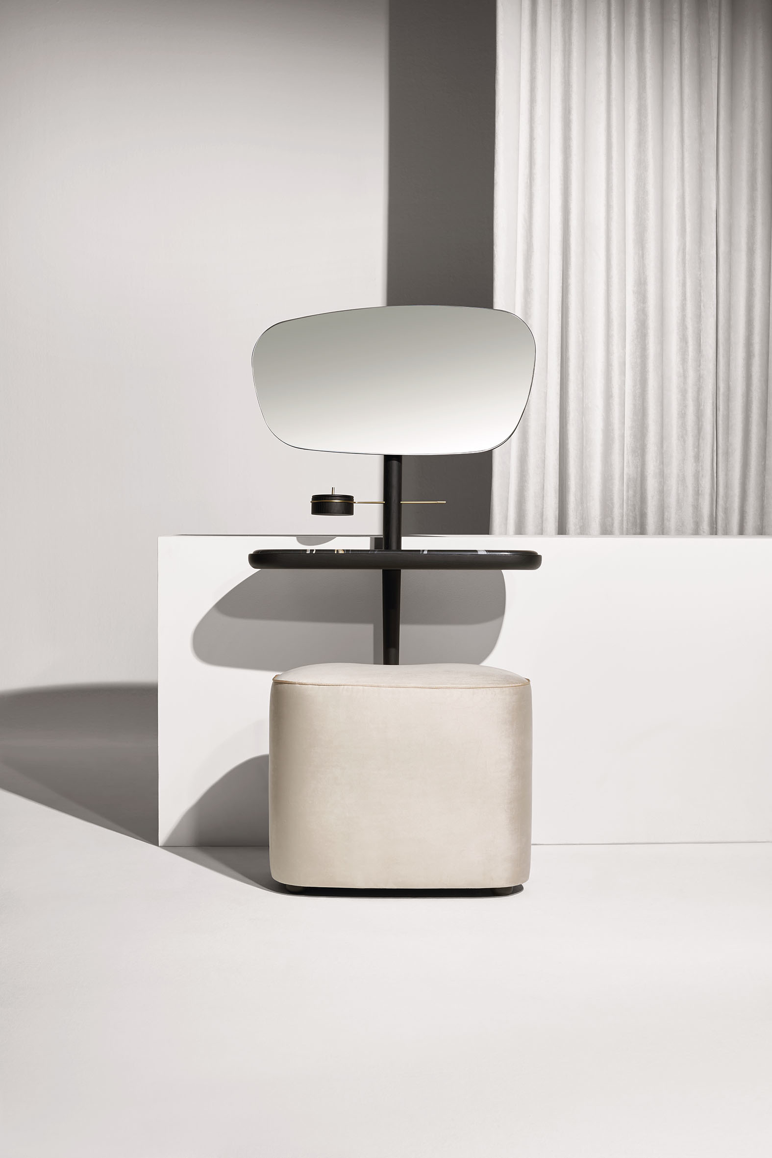 帶有絲綢裝飾的天鵝絨軟墊座墊位於梳妝台底部,功能更強大。 金屬細節和原始珠寶盒使其成為獨特、充滿女性氣質而精緻的單品。